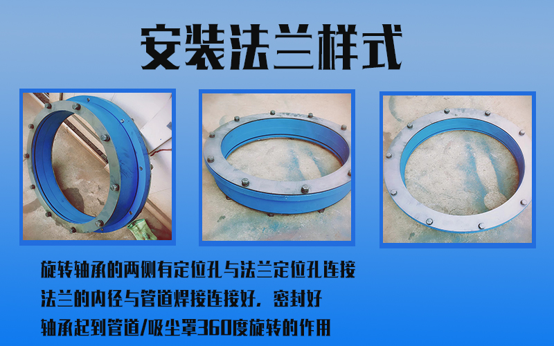 管道旋轉(zhuǎn)軸承又稱為旋轉(zhuǎn)法蘭,旋轉(zhuǎn)活節(jié),旋轉(zhuǎn)轉(zhuǎn)盤等多個名字,多安裝在電爐,中頻爐吸塵罩與管道連接的地方,可以使吸塵罩360度旋轉(zhuǎn),不影響電爐加料,出鐵,澆筑,非常方便,